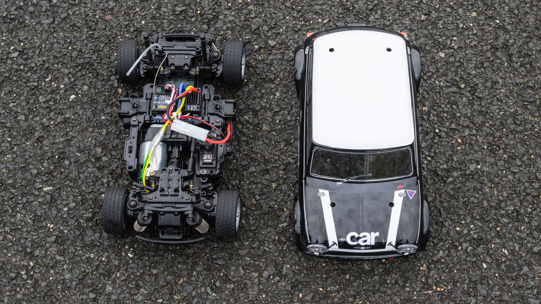 It’s certainly a more complicated kit to build than the TT-02 touring car. Instead of a single-piece bathtub chassis, the MB-01 consists of front and rear assemblies that screw together in a few different lengths to suit different bodyshells and tune the handling. The short wheelbase on this Mini is great for agility, while the longer Citroen DS kit is better for stability.