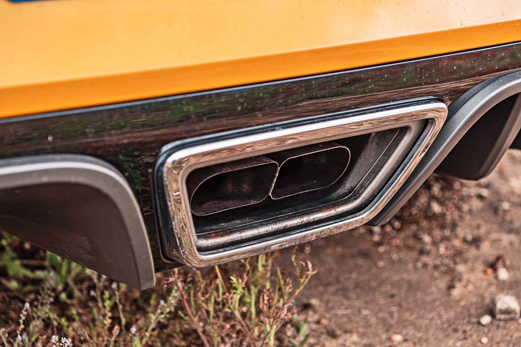 Red revcounter is your clue that Sport mode’s engaged. It peps up throttle response and gives a much more guttural soundtrack. But the gunfire from the exhaust on the over-run is too much, with pops even when you back off from modest throttle and low speed.