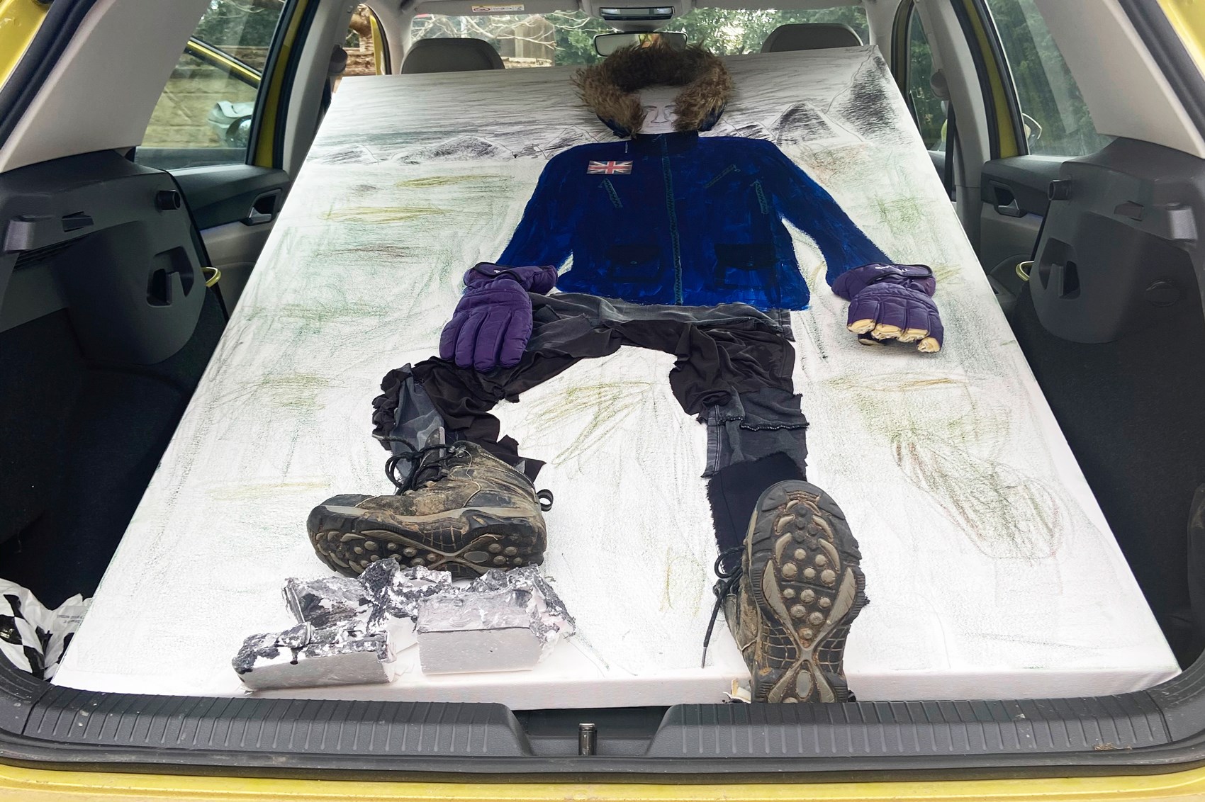 Due to a failure of online ordering the canvas for my son’s art project on the subject of explorers was not quite as anticipated and mixed-media Ranulph ended up somewhat more massive than planned. But with the rear seats laid flat and the fronts pushed forward, he slotted in the Golf as snugly as if he was in a sleeping bag at the North Pole.